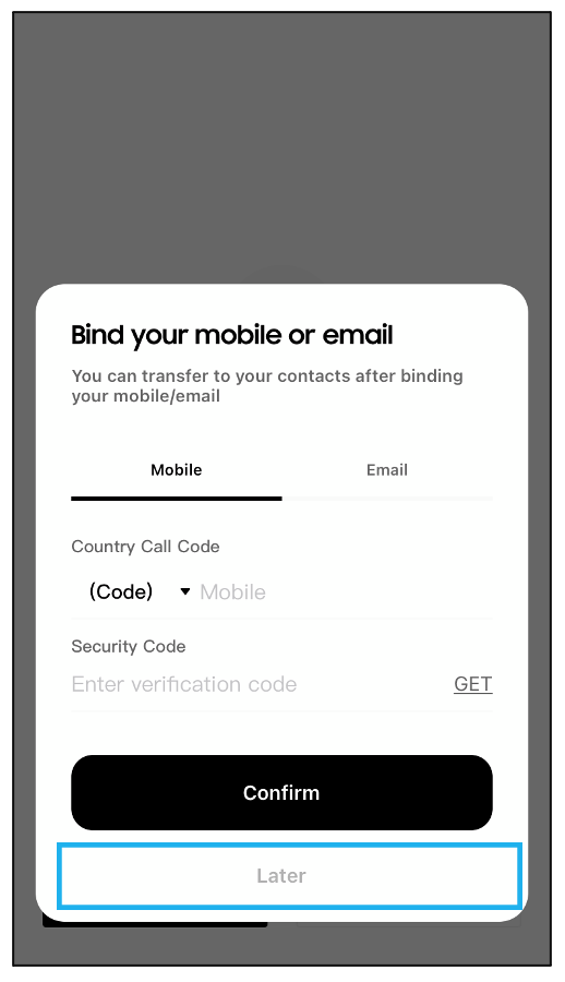 Input your mobile number or email address, and click “Confirm” to bind your ONT ID with your mobile or email. You can also click “Later” to bind at a later time more convenient for you.