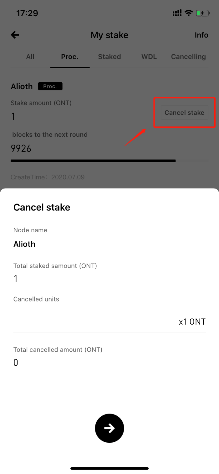 Click the “Cancel stake” button under “My stake” page. Before you cancel your stake, please click the “Info” on the top right corner and read the rules carefully. You can click the “Withdraw” button to withdraw your ONT.