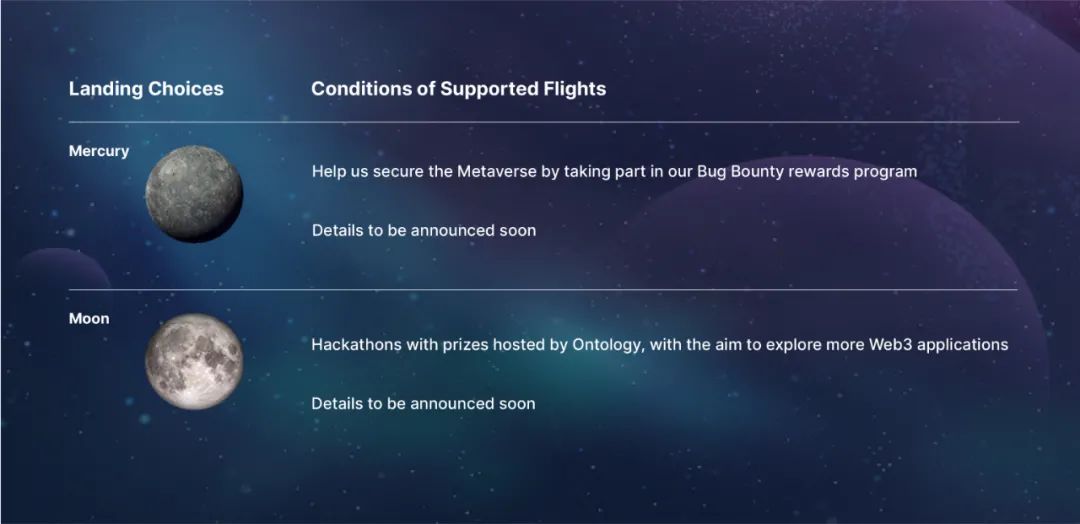 Should you possess an adventurous spirit, but not yet own a spacecraft and team, then do not fear. We have space on our public spacecraft where you can put your skills to use and be rewarded for your endeavors. These flights take you to Mercury and to the Moon, where you can take part in Bug Bounties and Hackathons. See the details below.