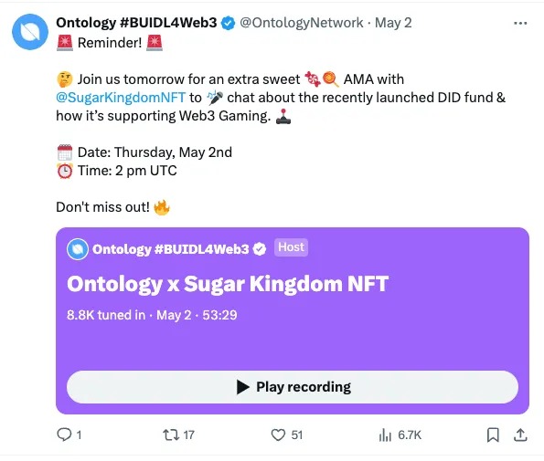 • Binance Live Session with Karmaverse: We joined Karmaverse on Binance live, sharing insights and updates about Ontology’s advancements.