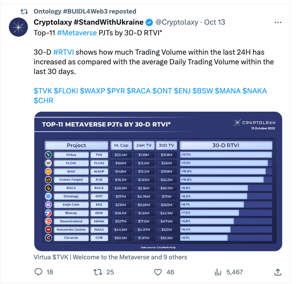 We’re also making waves in the Metaverse! Ontology was listed as a Top 11 Metaverse PLJ based on 30-D RTVI! 🌌