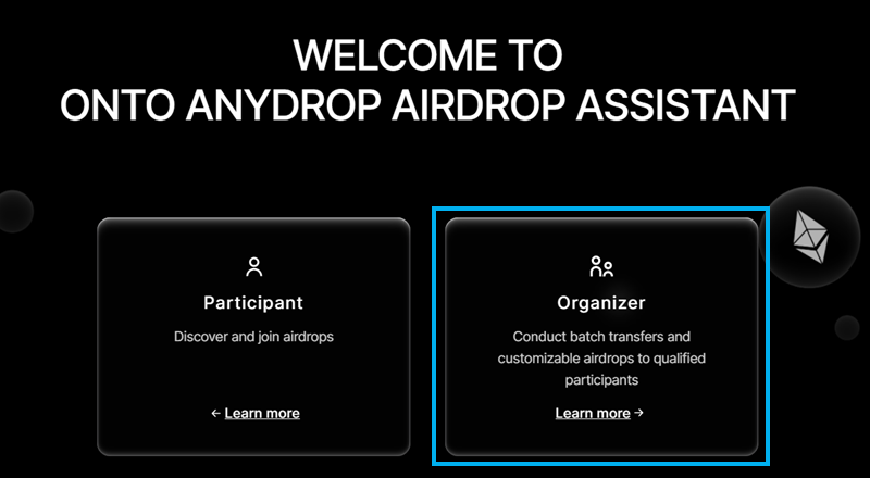-On the ONTO Anydrop webpage, click the “Organizer” button at the bottom right to open the organizer dashboard.