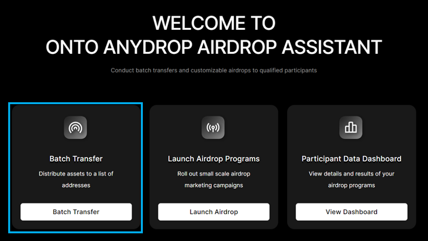 ONTO Anydrop Organizer can conduct batch transfers and customizable airdrops to qualified participants. Supported chains: Ethereum, Binance Smart Chain, OKExChain and Polygon.