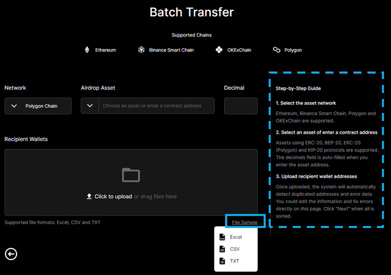 -Select the asset network, select an asset or enter a contract address, upload recipient wallet addresses