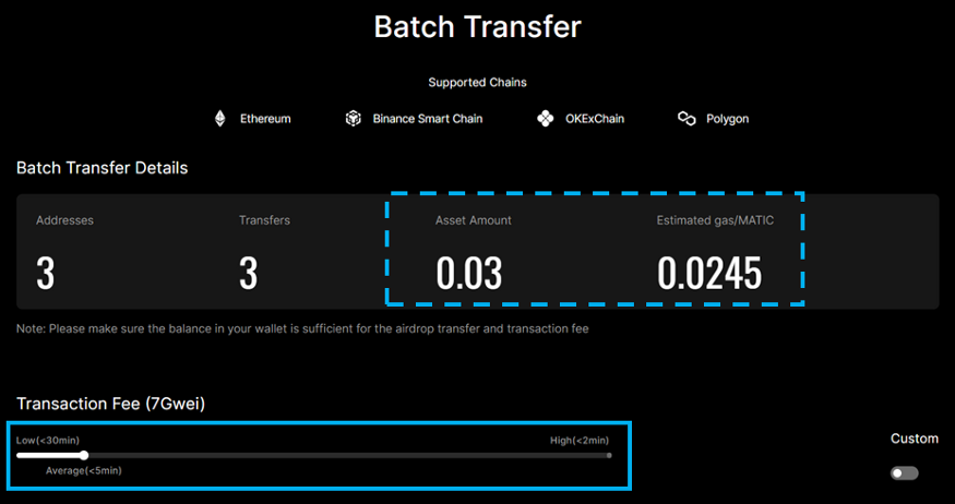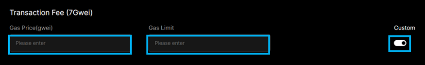 -Set transaction fee: use the slider to set the transaction fee, or turn on “Custom” to set the gas price and gas limit.