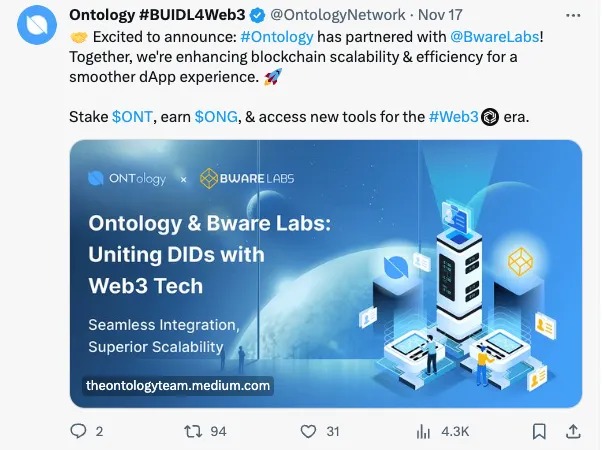 - Strategic Partnership: Ontology is thrilled to announce a groundbreaking partnership with Bware Labs! This collaboration aims to turbocharge blockchain scalability and efficiency, paving the way for a more robust digital future. 🚀