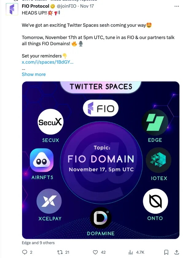 - Expanding Horizons: ONTO Wallet shared a Twitter Spaces with FIO protocol.