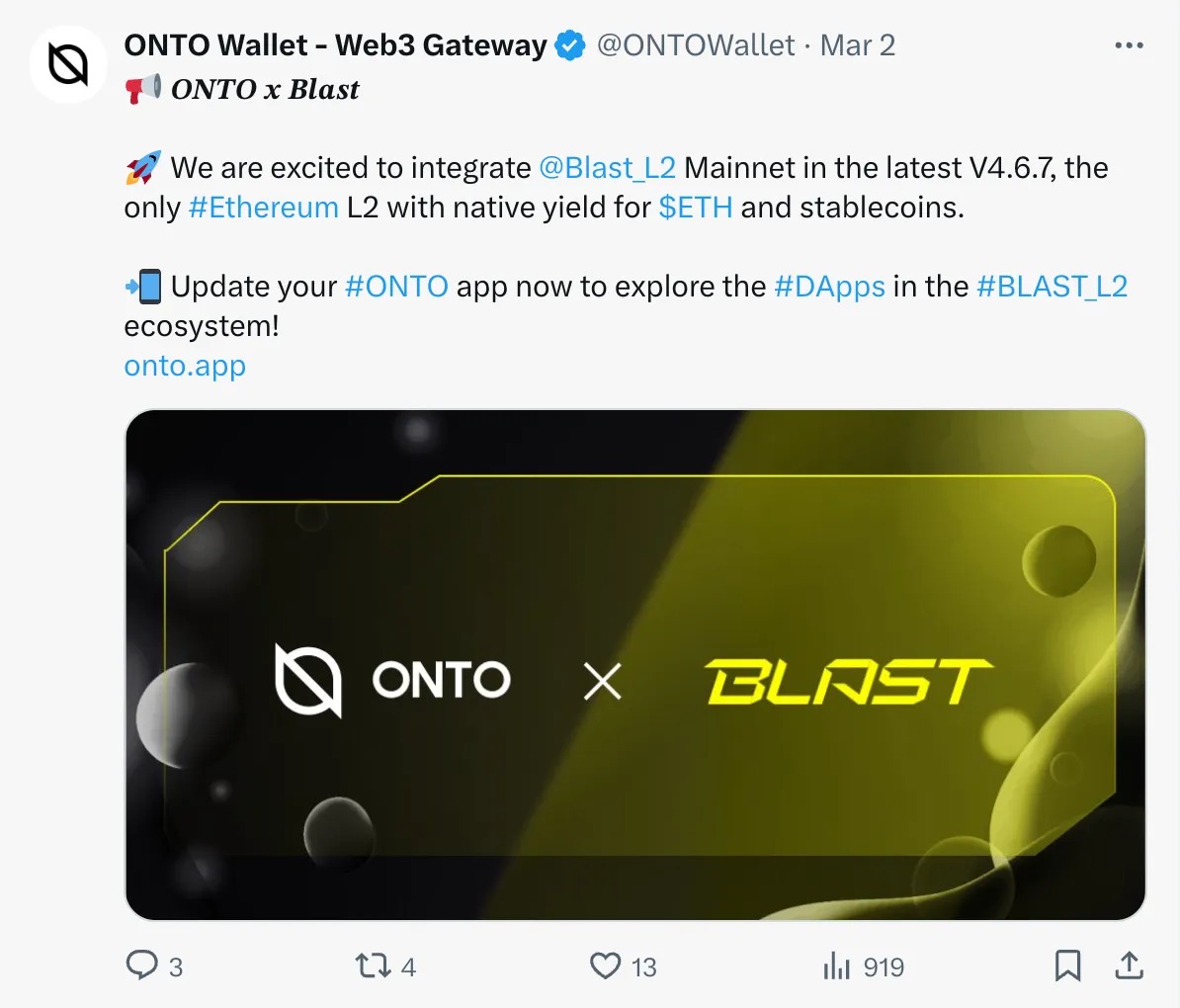 - ONTO Lists Blast: Expanding our ecosystem, ONTO has now listed Blast, offering our users more options.