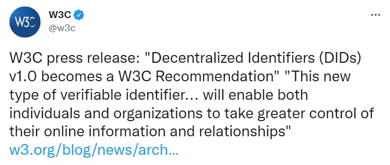 W3C press release: “Decentralized Identifiers (DIDs) v1.0 becomes a W3C Recommendation”, Ontology ONT ID framework is built on this standard, and its definitions and features are extended to better fit application scenarios.