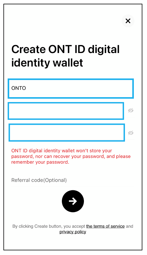 Open ONTO, set a wallet name and password, and click the arrow button to create your ONT ID.