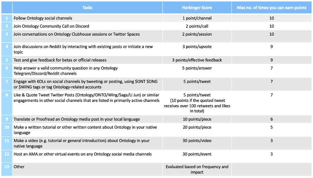Easy! Simply complete the tasks below and gain 200 points to be qualified to become a Harbinger. Once you’ve reached a Harbinger Score of 200, fill in the form to let us know!Project/Product/Social Channel involvement (including but not limited to Ontology, ONTO, Wing, SAGA, DeID Summit, Li Jun)