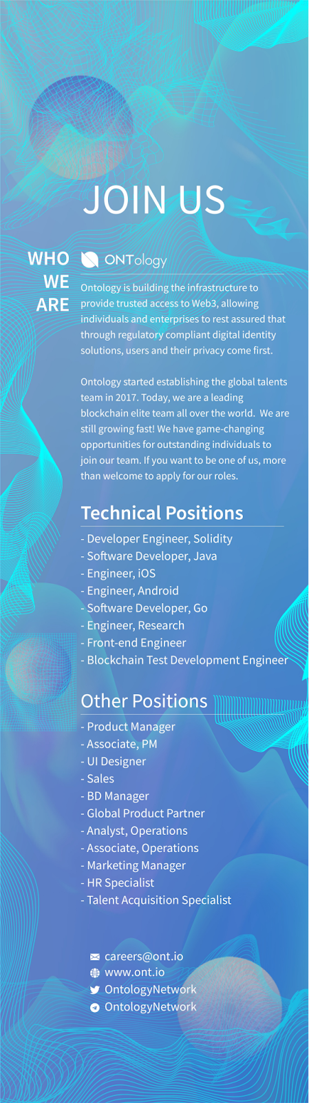 If you or anyone you know is a perfect fit for any of the roles above, please feel free to contact us at careers@ont.io for more details. Our global Harbingers are also glad to help you onboard. Looking forward to meeting you and having you join us in our mission to bring true decentralization to identity & data practices!