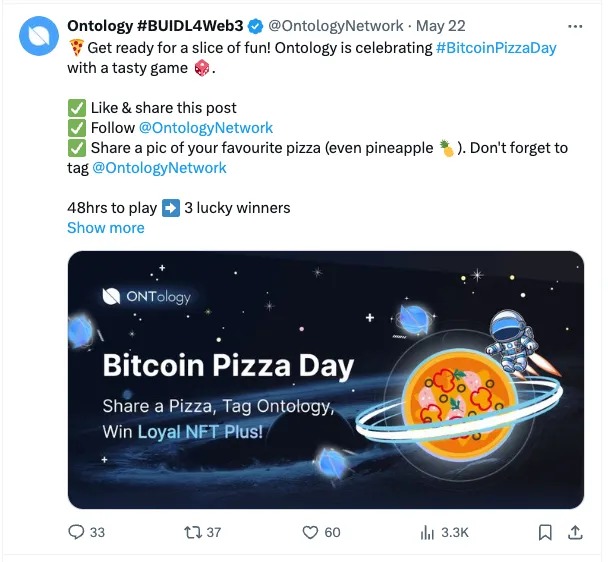 • Bitcoin Pizza Day Celebration: We celebrated Bitcoin Pizza Day with the community sending pizzas and tagging Ontology — a fun and engaging activity for all!