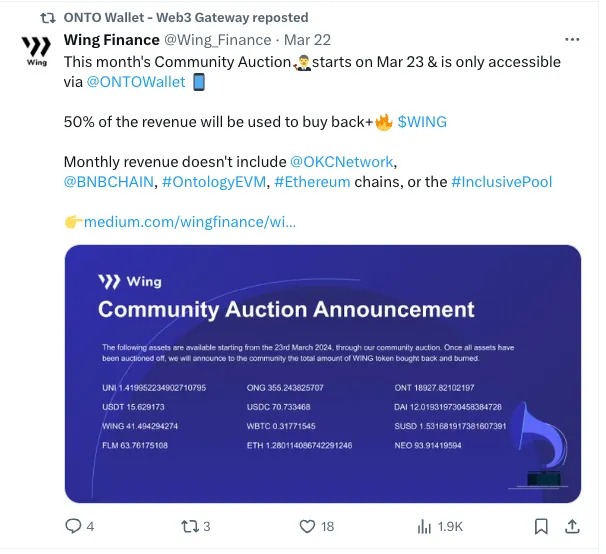 - Exclusive Access via ONTO: Wing Finance’s auction feature is now exclusively accessible through the ONTO wallet, offering unique opportunities to our users.