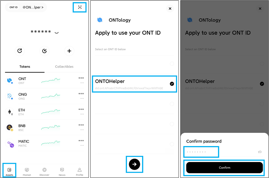 -Check the ONT ID to log in with, click the arrow icon below, enter the ONT ID wallet password, and then click “Confirm” to finish.