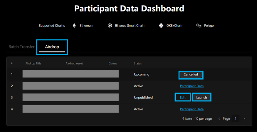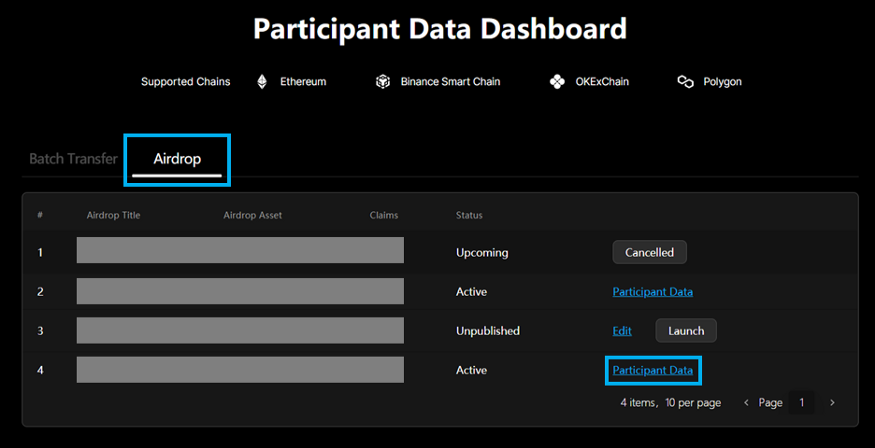 -On the “Participant Data Dashboard” page, click “Airdrop” to check and manage a saved airdrop program.