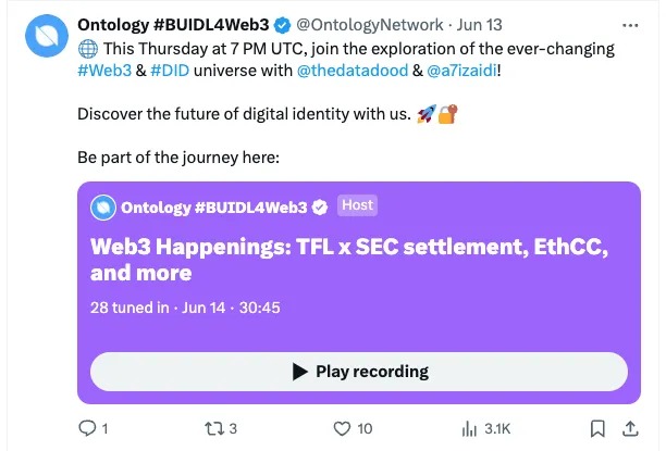 - Telegram Discussion on Interoperable DID Solutions: This week, led by Ontology Loyal Members, we explored “Interoperable DID Solutions: Web2, Web3, and Beyond,” discussing the implications for KYC, login systems, and peer-to-peer interactions.