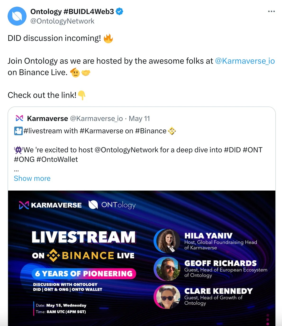 - Hosted by Karmaverse on Binance Live: Karmaverse hosted us on Binance Live, offering a platform to discuss Ontology’s role in the evolving blockchain ecosystem and our upcoming projects.
